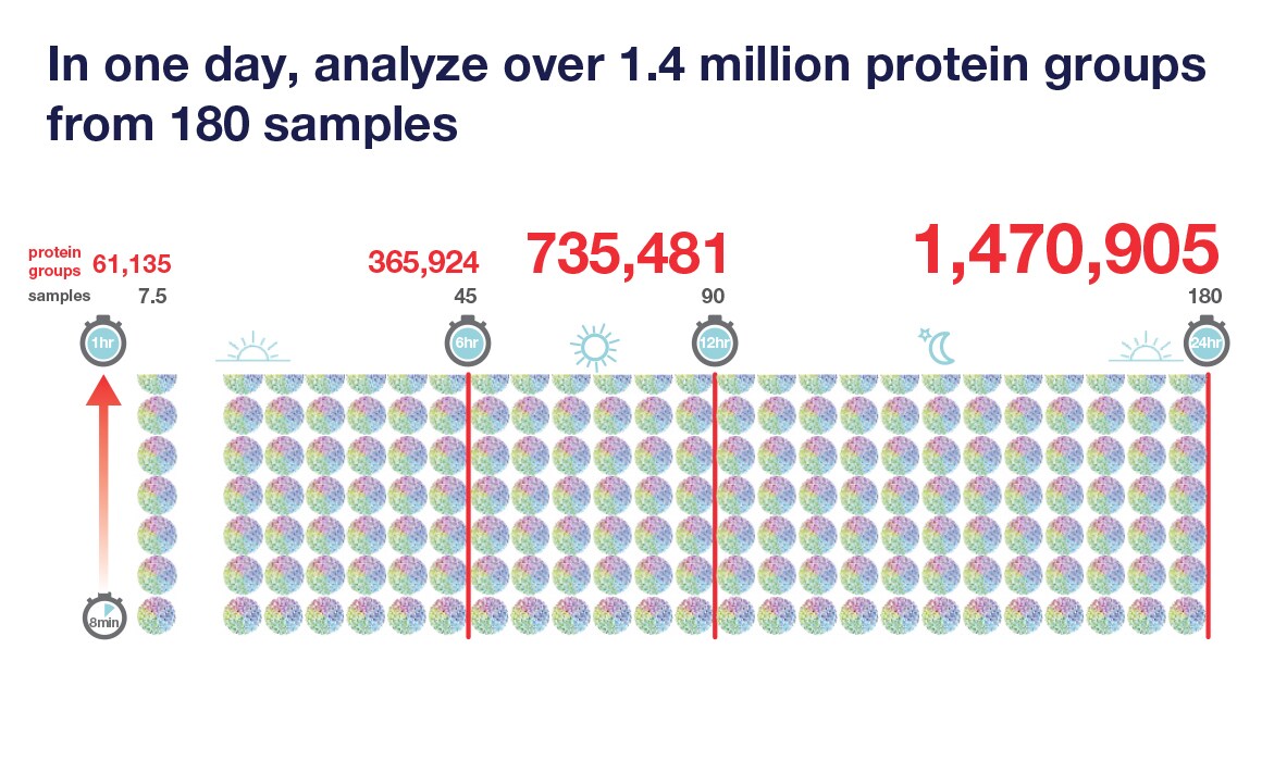 必须达到高通量,才能扩大样本队列大小。Orbitrap Astral 质谱仪可实现较快的处理速度,每个进样至进样循环的运行时间为8分钟,这意味着您每天可以分析180份样本。不仅仅是高通量,而且您每次进样都可以为典型细胞裂解物样本鉴定超过8,000种蛋白质。这开启了蛋白质组学的新范式,一天之内就能在180份样本中测量140多万个蛋白质组。凭借较快的处理速度,在一年内能够使用一台仪器测量数以万计的样本,这扩大了可以进行的研究规模,能够提高统计能力并发现新见解。